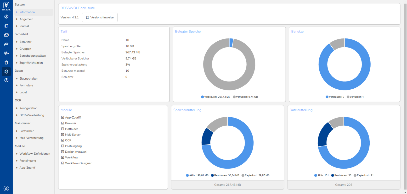 Dashboard für Analyse und Steuerung Haben Sie Aufgaben aus den Workflows, den verfügbaren Speicherplatz und die angelegten Benutzer immer im Überblick. | | | |